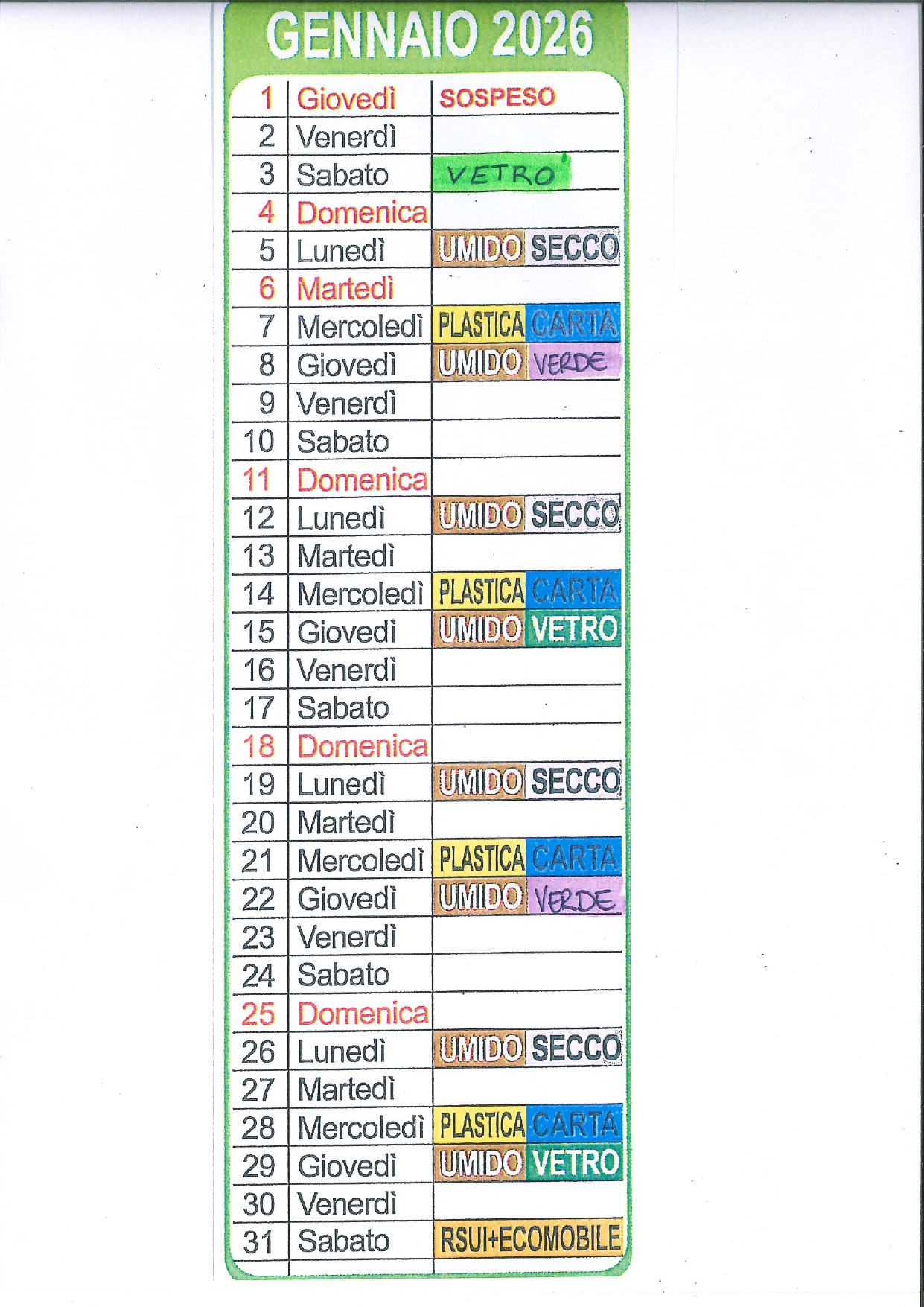Descrizione Raccolta rifiuti Gennaio 2026 Allegati Documenti gennaio 2026 [.pdf 512,89 Kb - 29/12/2025 - 30/12/2025] Ultimo aggiornamento pagina: 30/12/2025 11:50:56