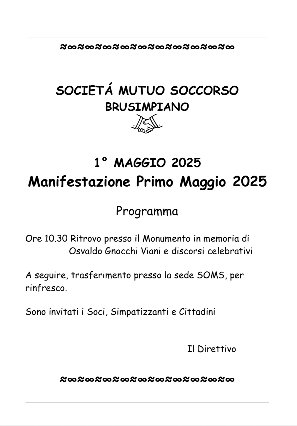 A seguire, trasferimento presso la sede SOMS, per rinfresco.