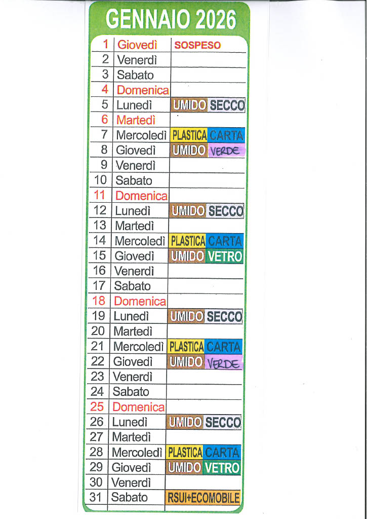 Descrizione Raccolta rifiuti Gennaio 2026 Allegati Documenti gennaio 2026 [.pdf 442,71 Kb - 29/12/2025] Ultimo aggiornamento pagina: 29/12/2025 15:27:55
